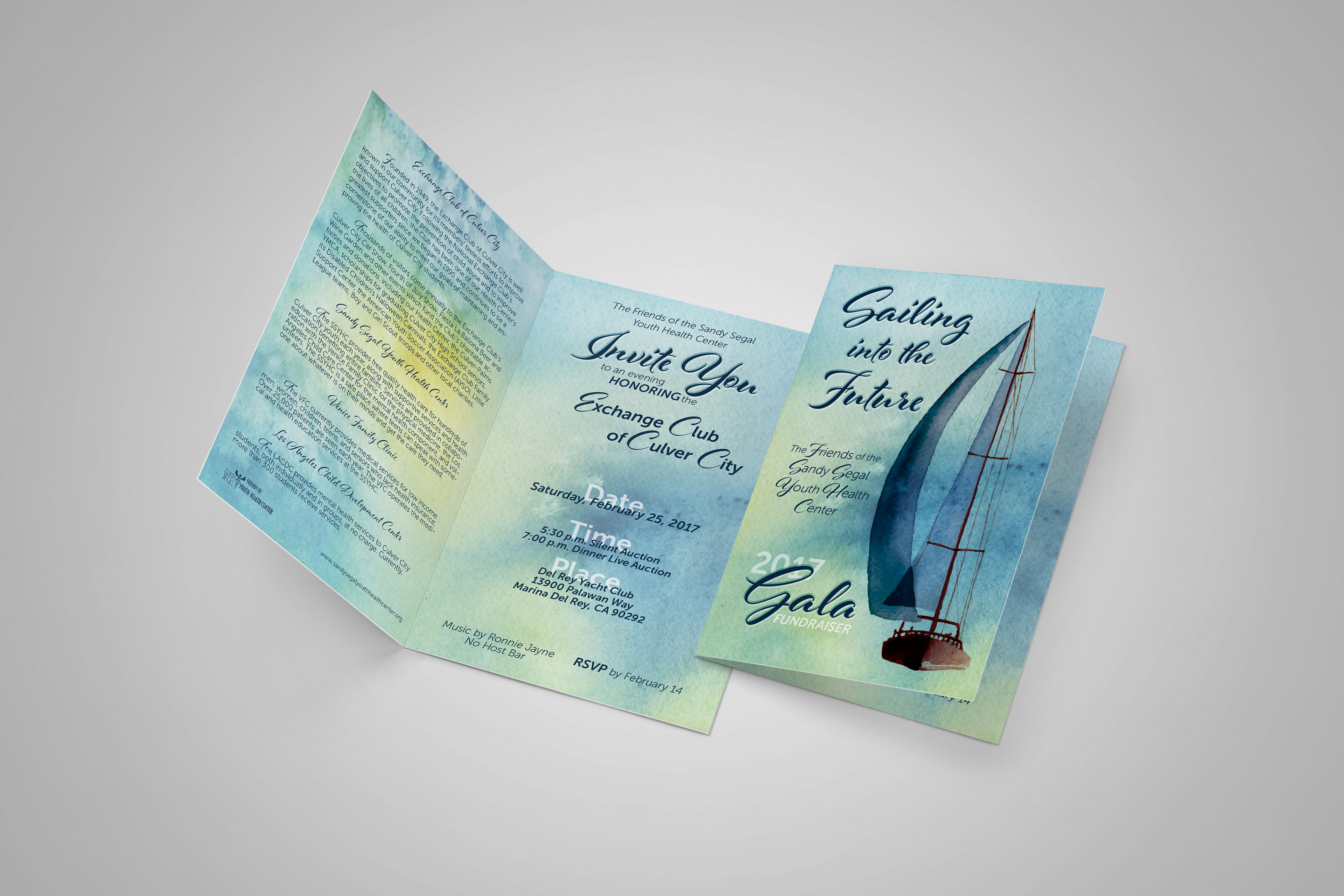 Sandy Segal Youth Health Center has a yearly Gala. The challenge was a large amount of text fills the entire front and back of this invitation, along with inserts for RSVP and raffle tickets.